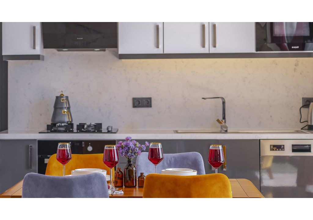 Detayları; Buzdolabı, bulaşık makinesi, fırın, 4’lü ocak, mikrodalga fırın, elektrikli su ısıtıcı, yemek takımı, tava, tencereler, çatal bıçak ve mutfak ekipmanları bulunmaktadır.