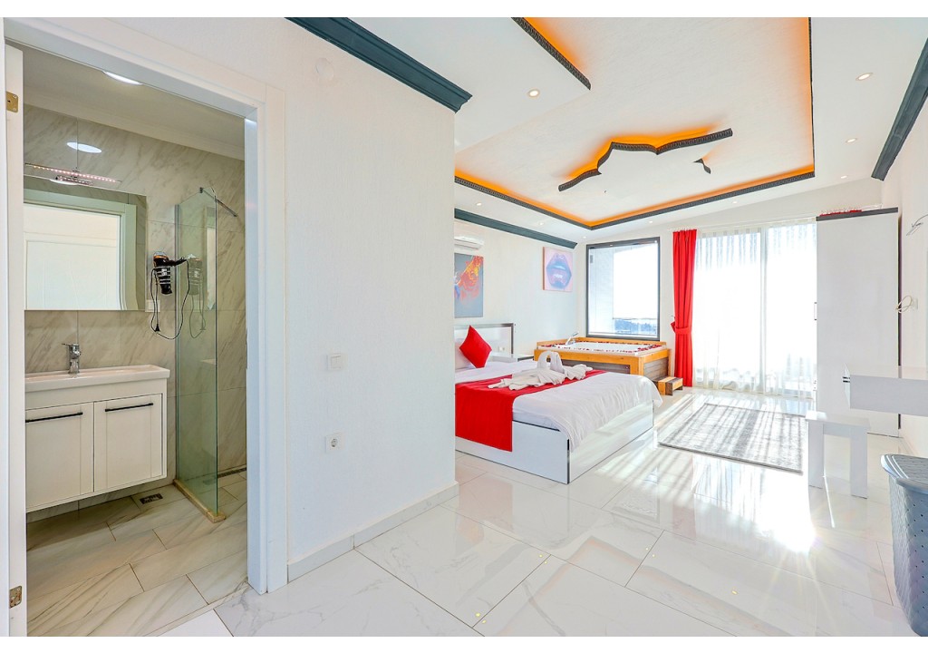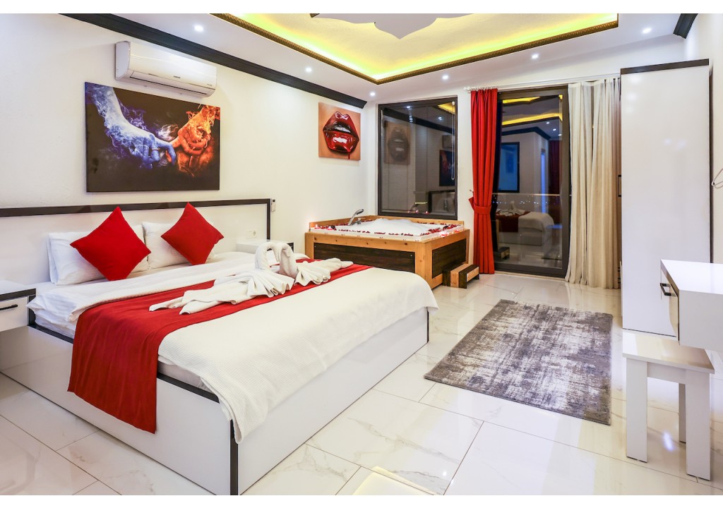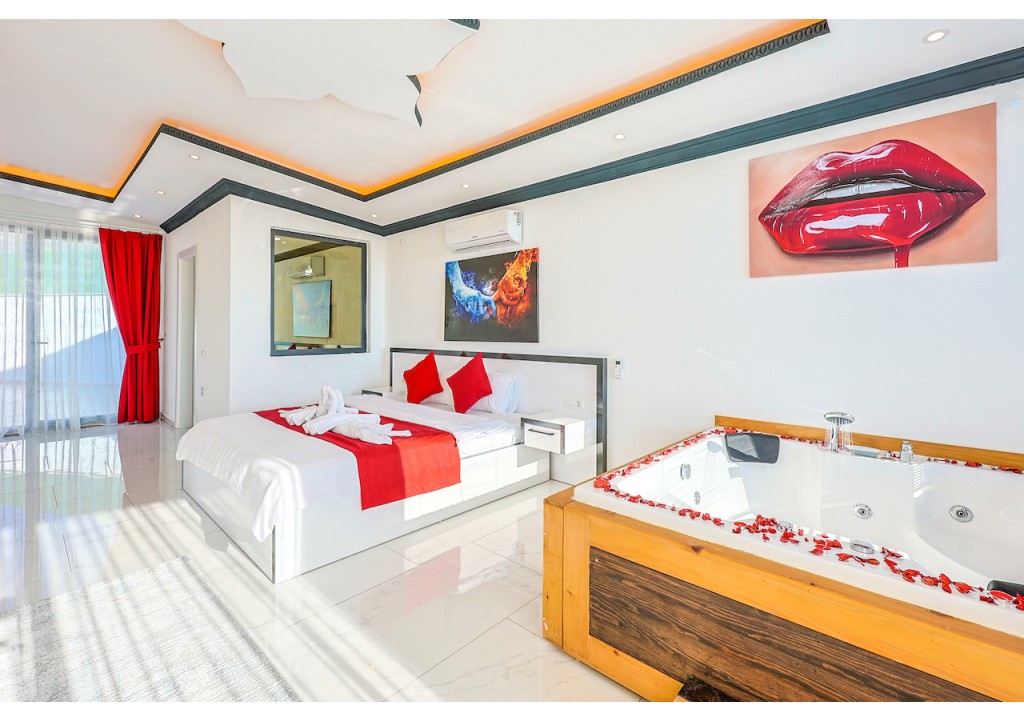 Detayları; Çift kişilik yatak, makyaj masası, komidin, klima, elbise dolabı, jakuzi, banyo ve tuvalet bulunmaktadır.