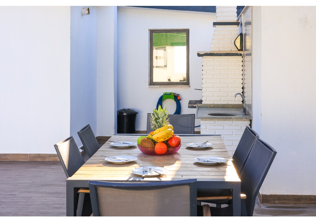 Detayları; Şezlonglar güneş şemsiyesi, 4 kişilik yemek masası, oturma grubu.