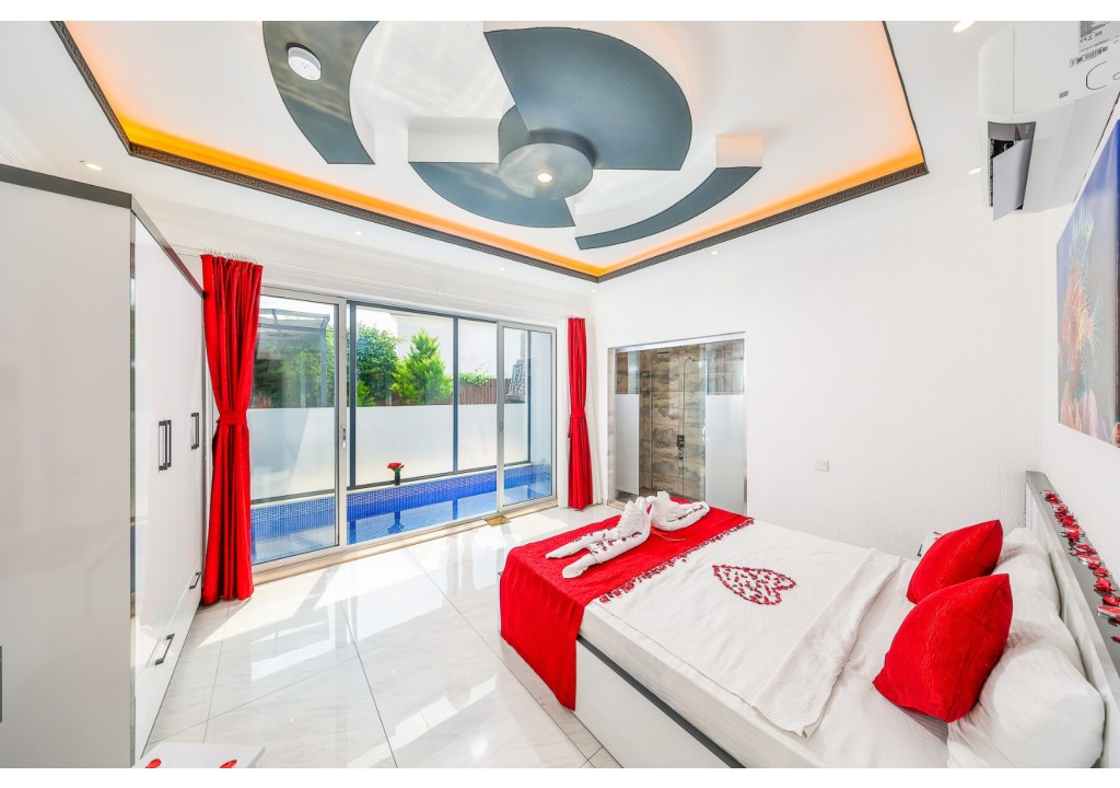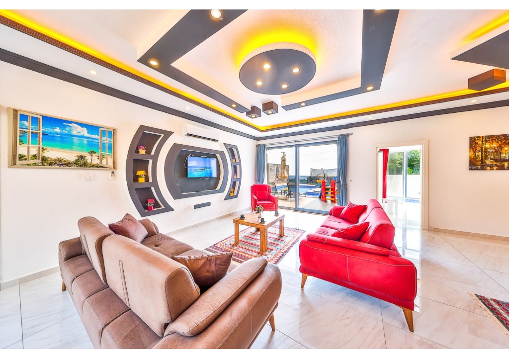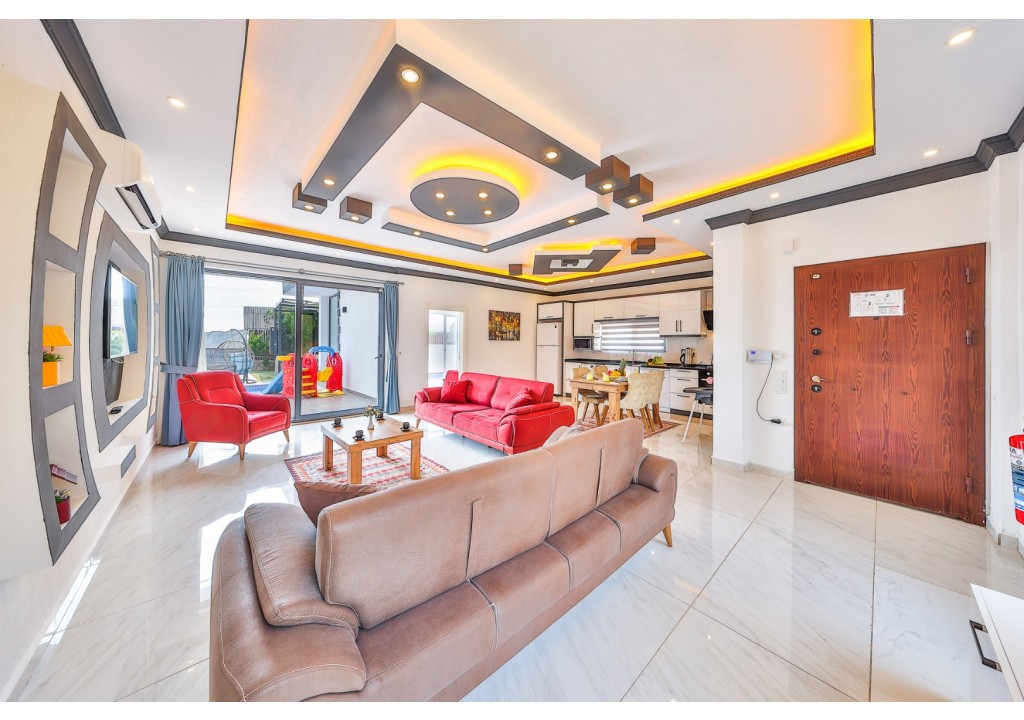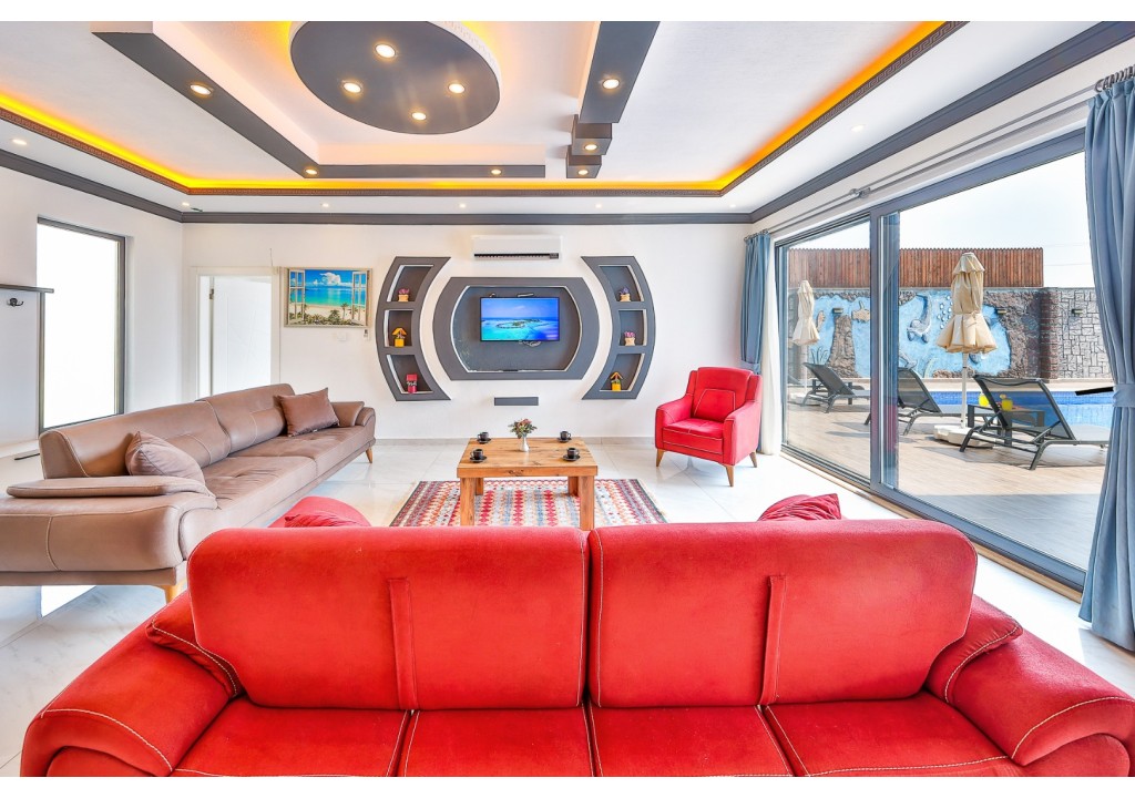 Detayları; Oturma grubu, Uydu TV (LCD), Klima, 4 kişilik yemek masası, Havuz terasına çıkış,