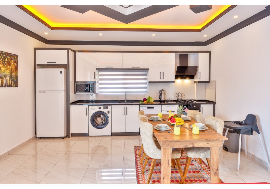 Detayları; Buz dolabı, Bulaşık makinesi, Fırın 4’lü Ocak (ankastre), Mikrodalga fırın, Elektrikli su ısıtıcı, 4 kişilik yemek takımı, Tava, Tencereler, Çatal bıçak vb.