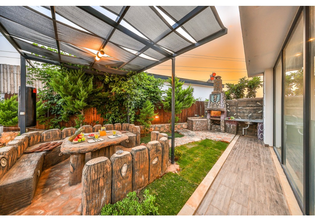 Detayları; Şezlonglar güneş şemsiyesi, 4 kişilik yemek masası, oturma grubu.