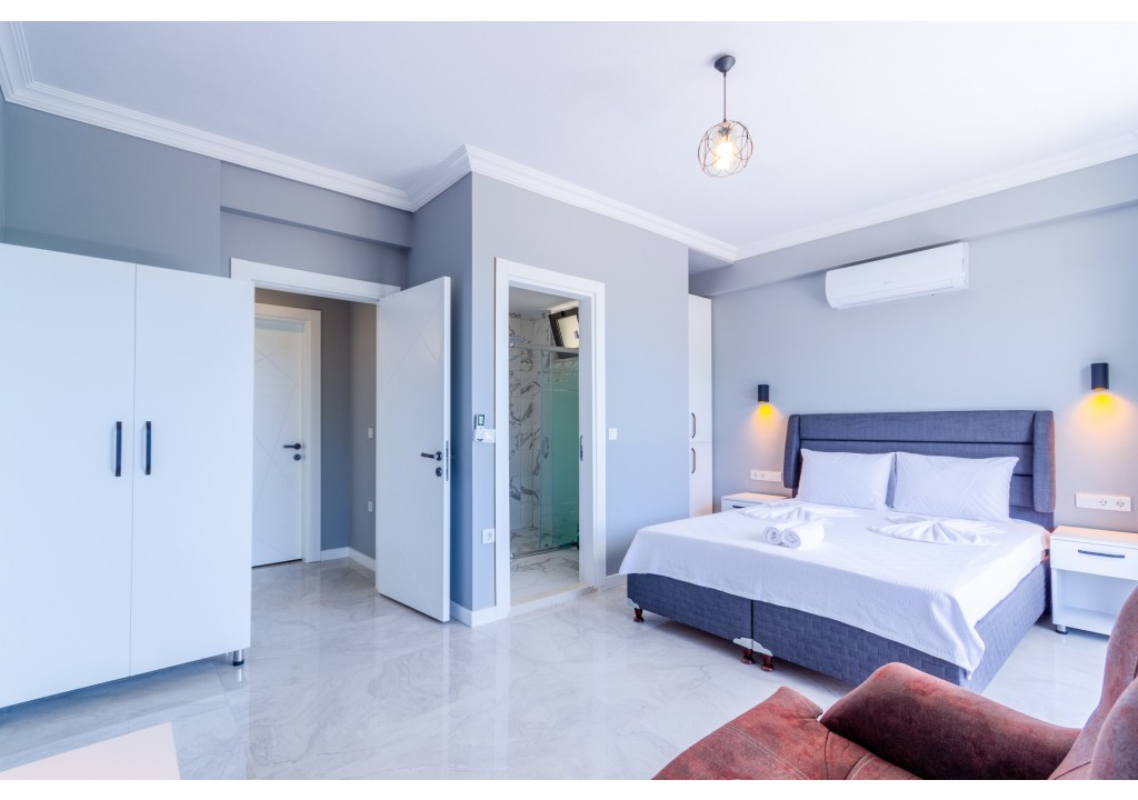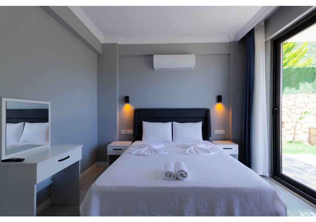 Detayları; Çift kişilik yatak, elbise dolabı, makyaj masası, klima, banyo ve tuvalet bulunmaktadır.