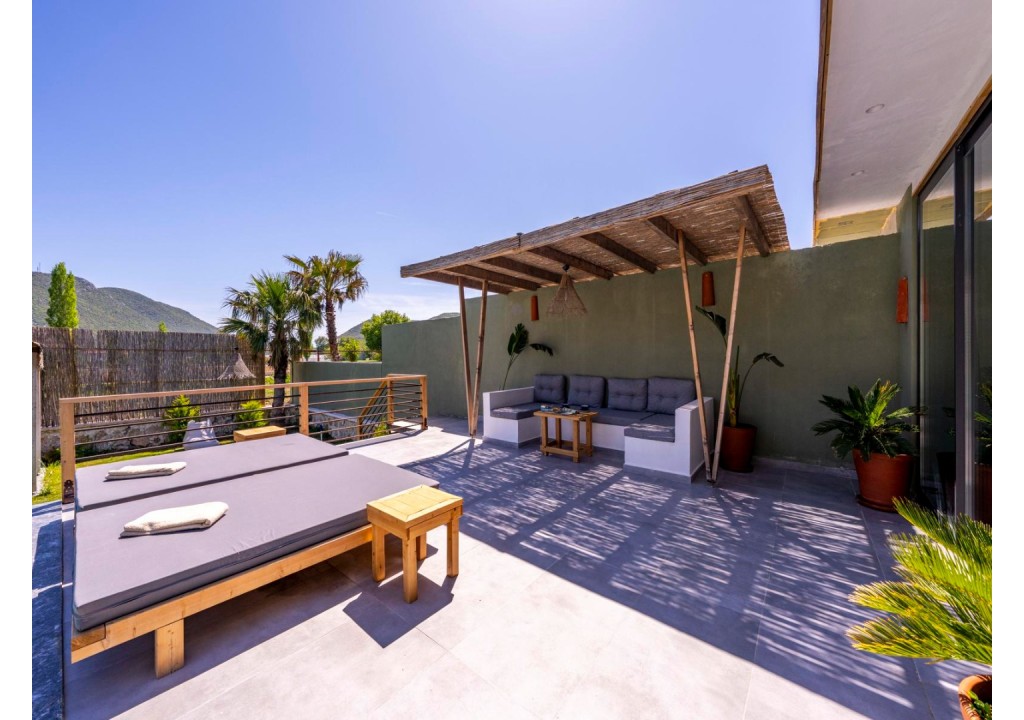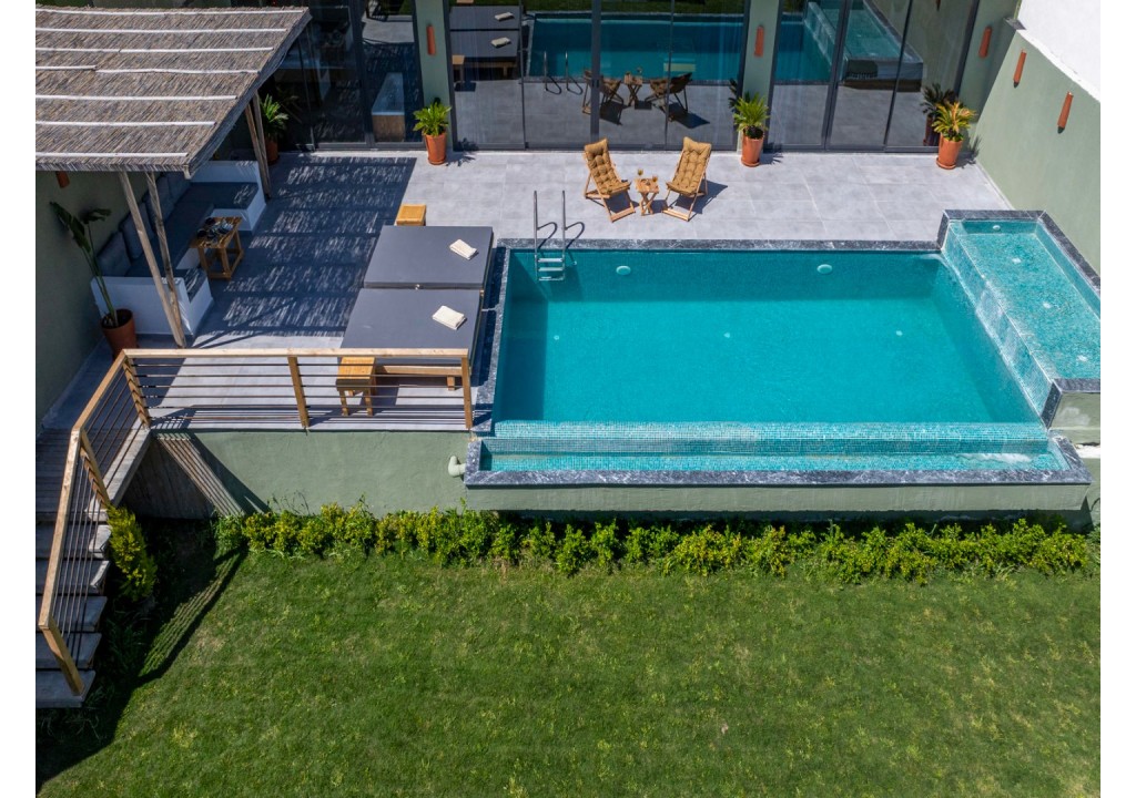 Detayları; Şezlonglar, güneş şemsiyesi, 6 kişilik yemek masası, oturma grubu.