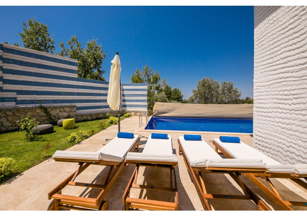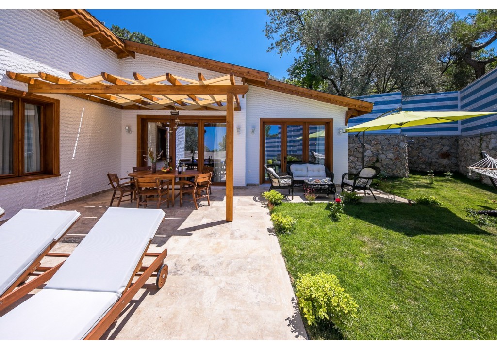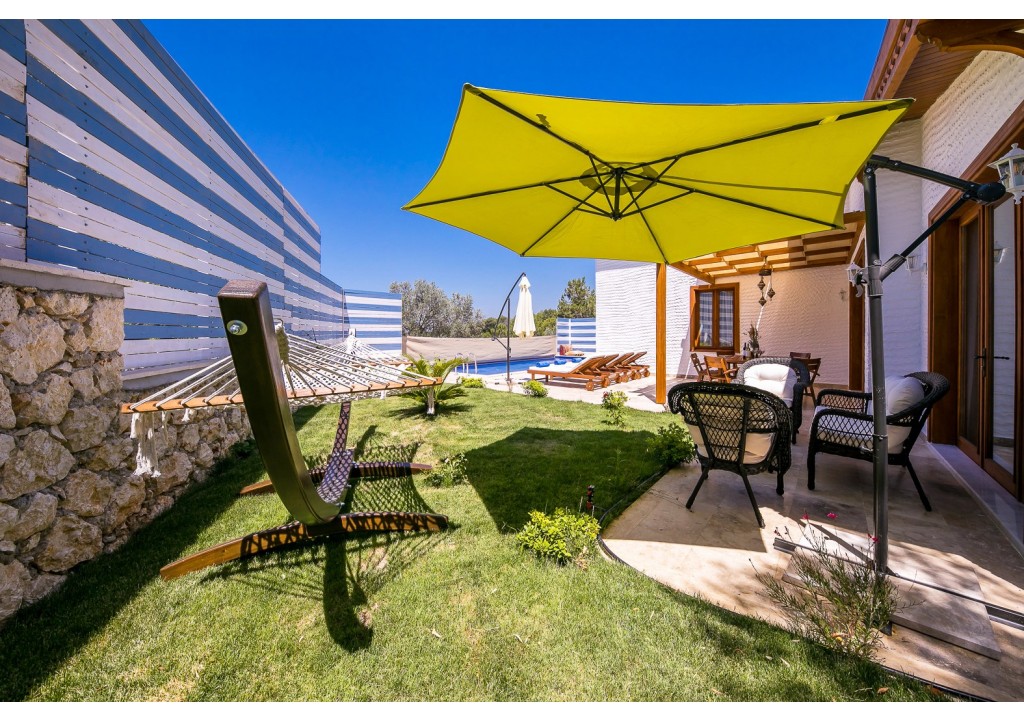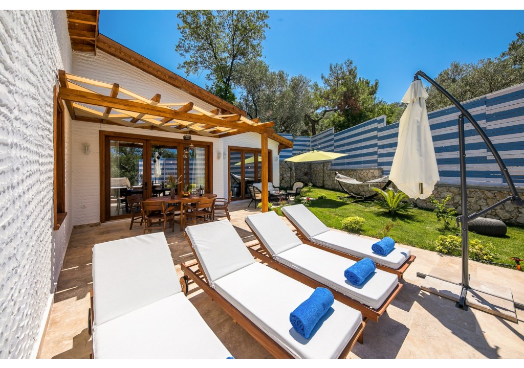 Detayları; Şezlonglar, güneş şemsiyesi, 4 kişilik yemek masası, oturma grubu.