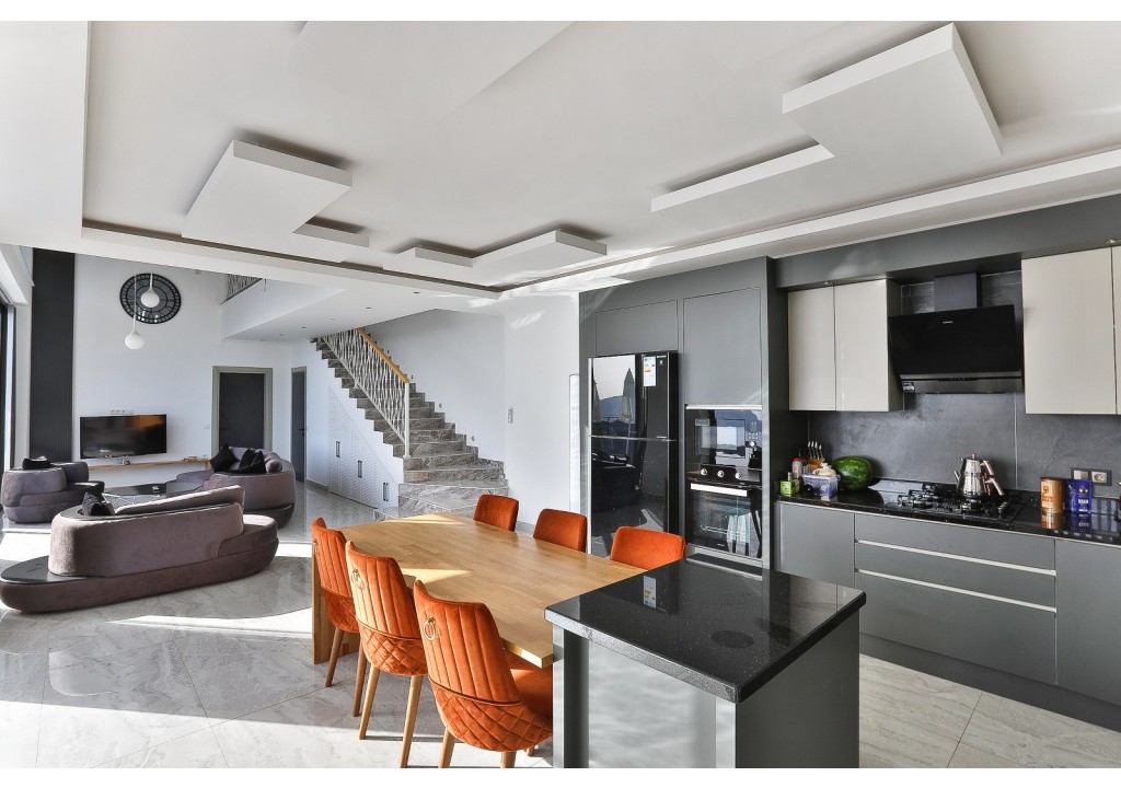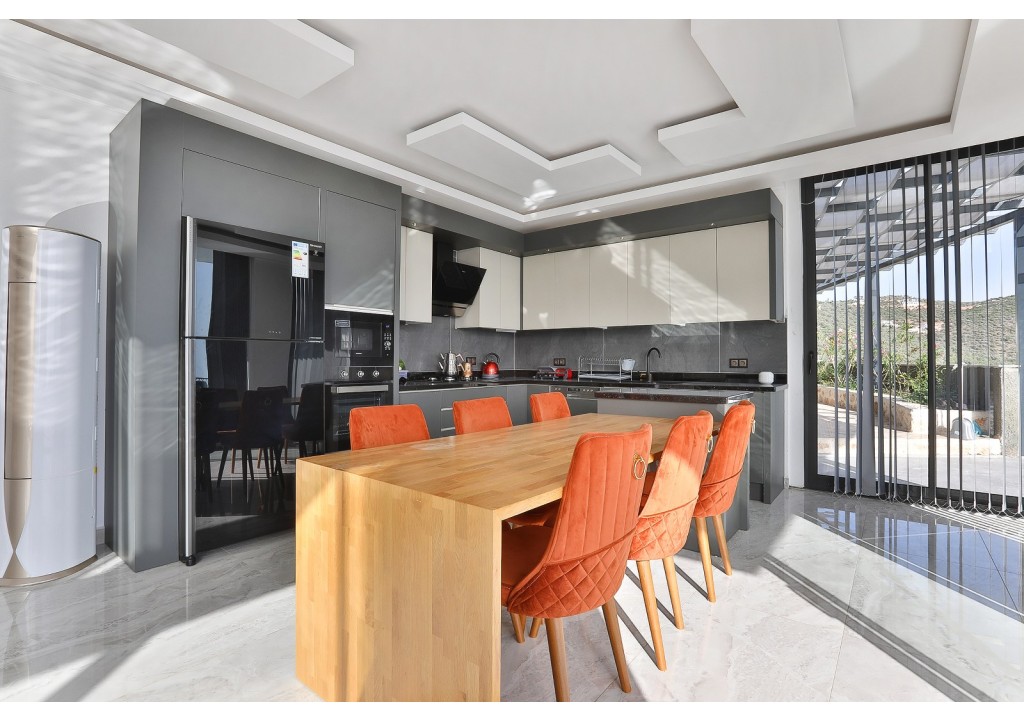 Detayları; Amerikan tarzı mutfak içerisinde buzdolabı, bulaşık makinesi, çamaşır makinesi, fırın, kahve makinesi, 4’lü ocak (ankastre), mikrodalga fırın, elektrikli su ısıtıcı, tava & tencere vb. mutfak ekipmanları ve 6 kişilik yemek takımı bulunmaktadır.