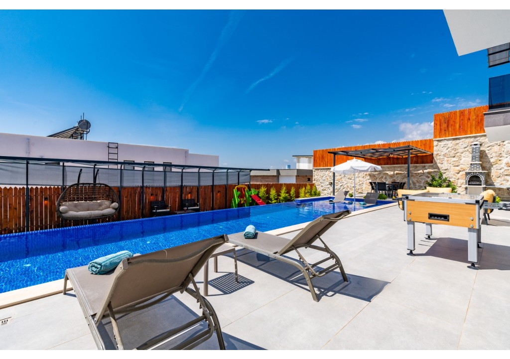 Detayları; Şezlonglar, güneş şemsiyeleri, yemek masası ve oturma grubu bulunmaktadır.