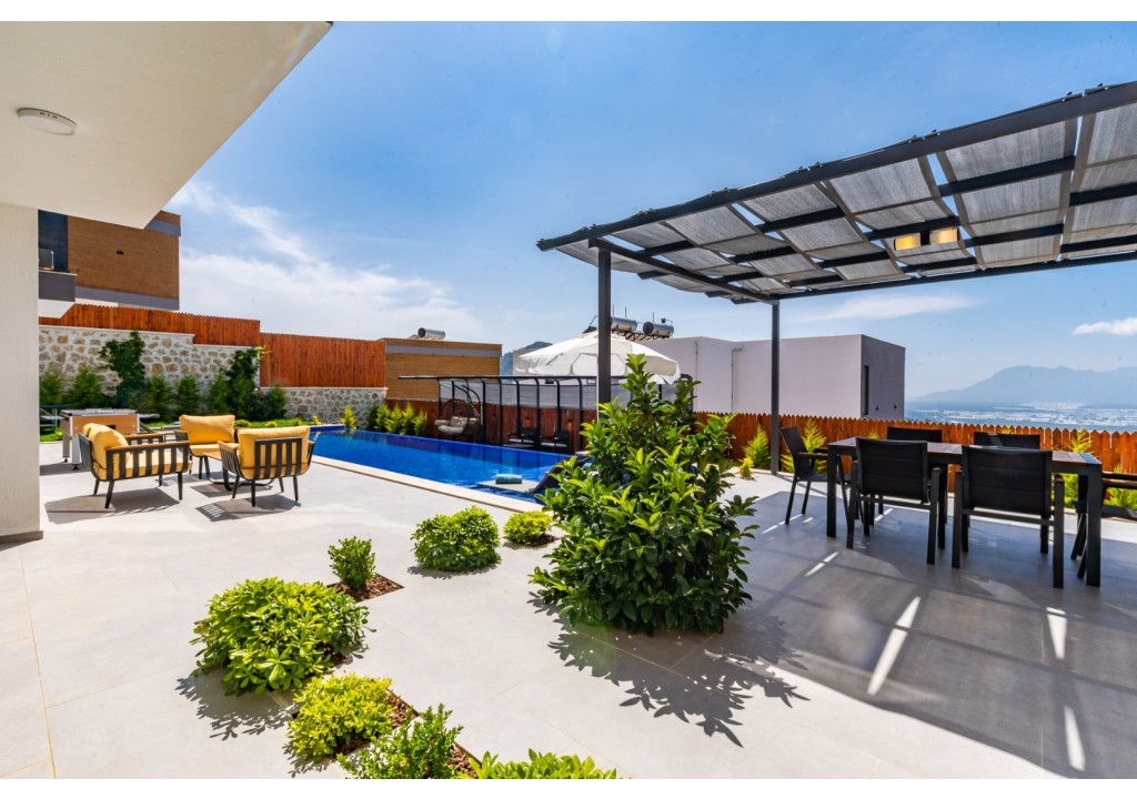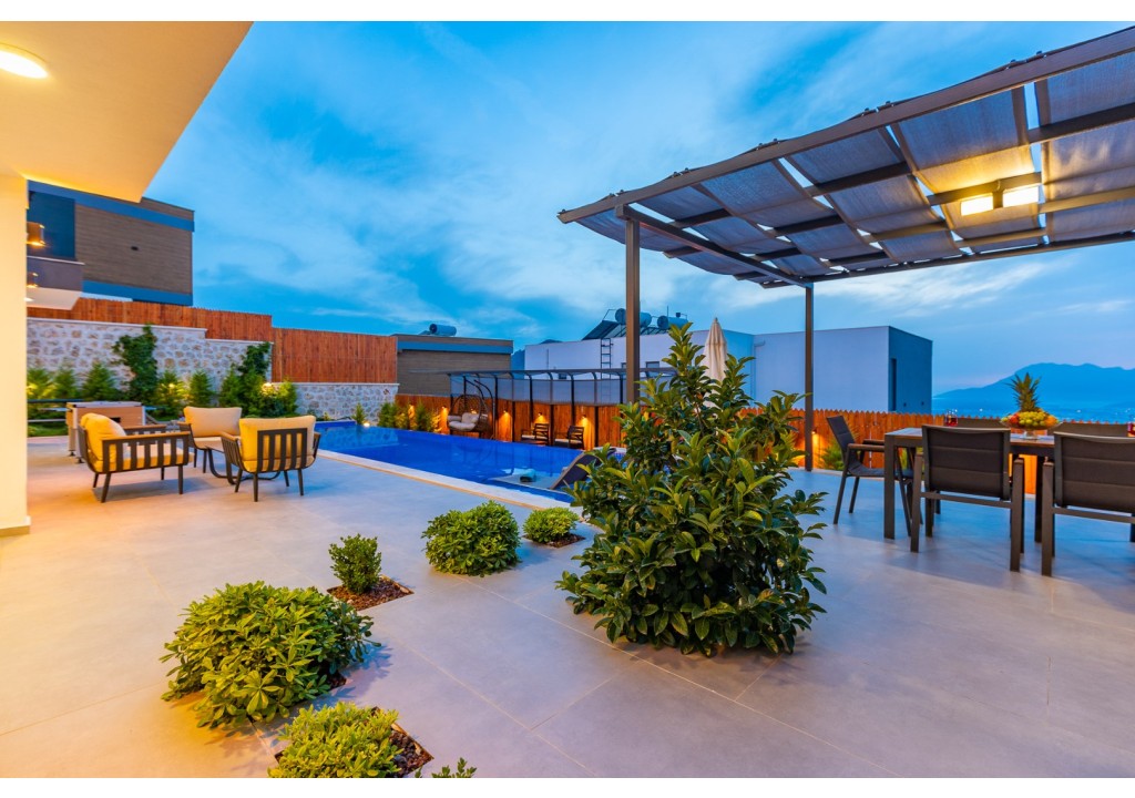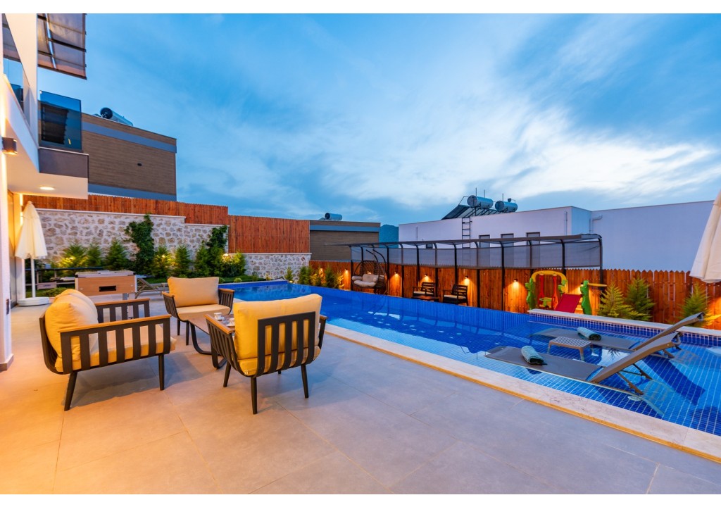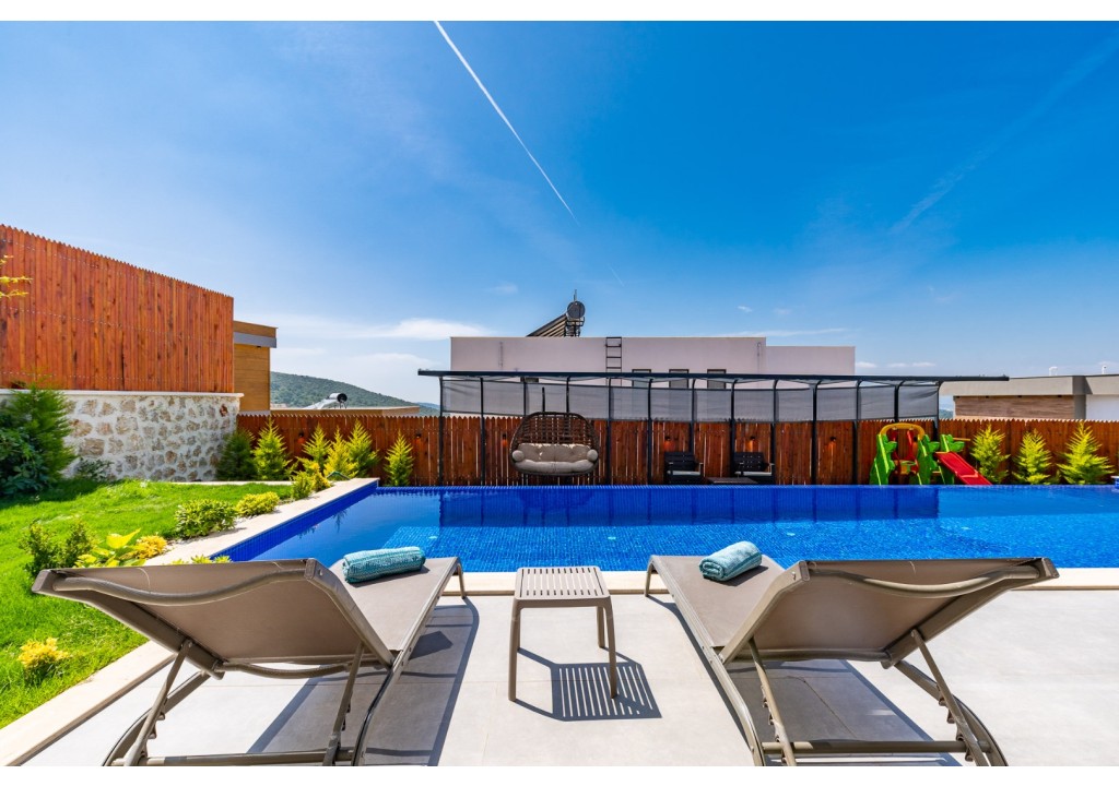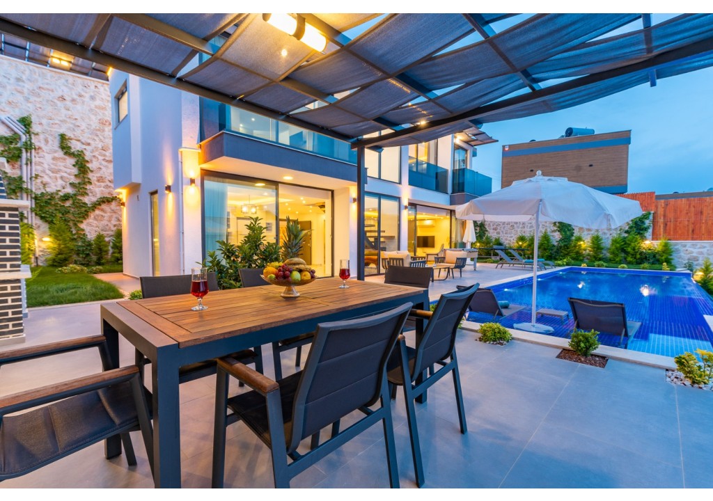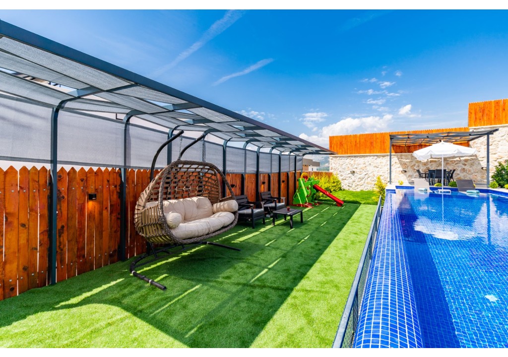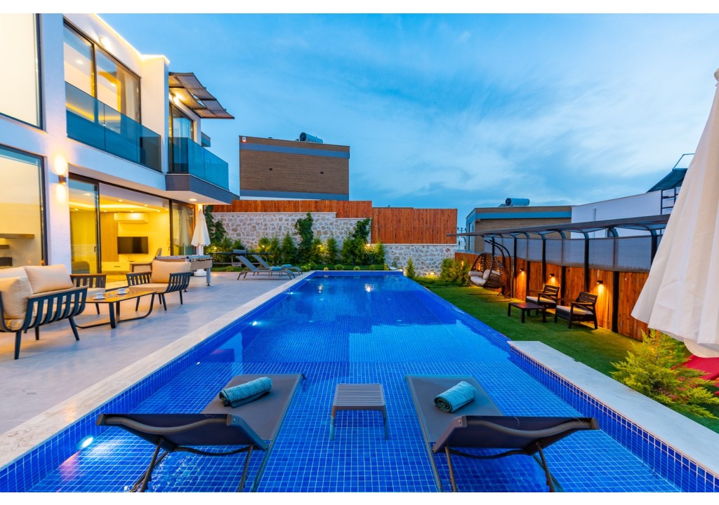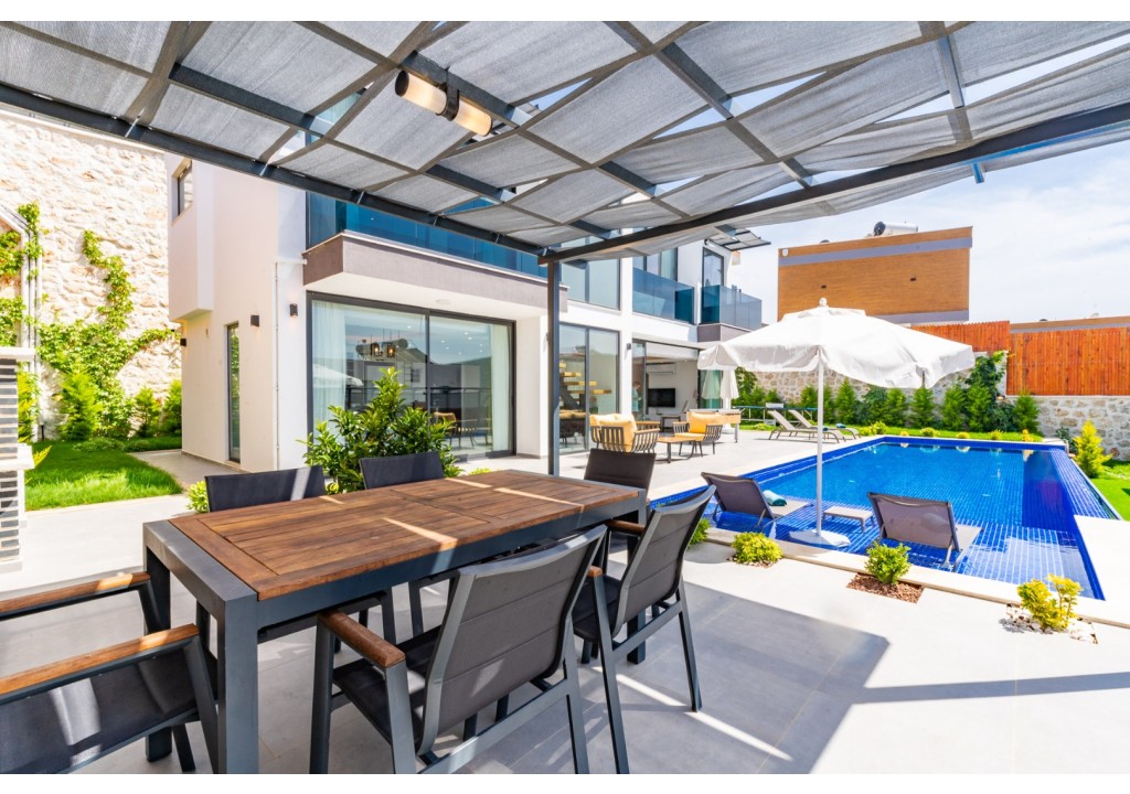 NOT: Villamızın havuz terası büyük ölçüde korunaklıdır; ancak diğer villalara kıyasla görünürlük oranı daha yüksek olup korunaklılık seviyesi nispeten daha düşüktür. Havuz çevresinde herhangi bir perdeleme sistemi bulunmamaktadır. Bu nedenle tam korunaklı bir villa tercih eden misafirlerimiz için uygun değildir.