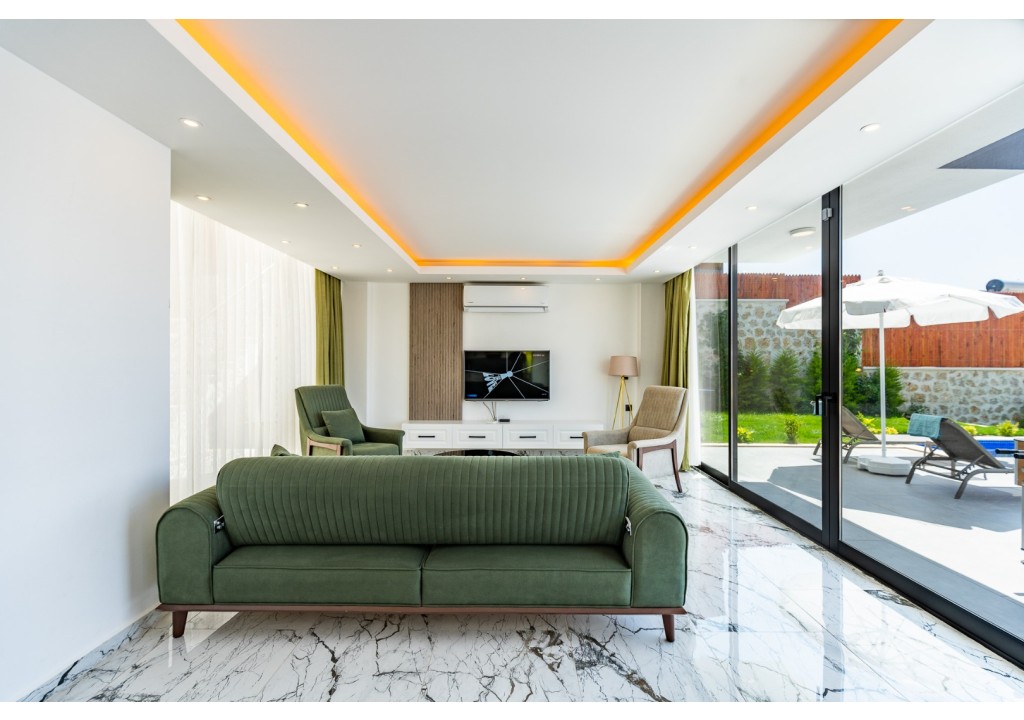 Detayları; Oturma grubu, uydu TV, klima, yemek masası ve havuz terasına çıkış bulunmaktadır.
