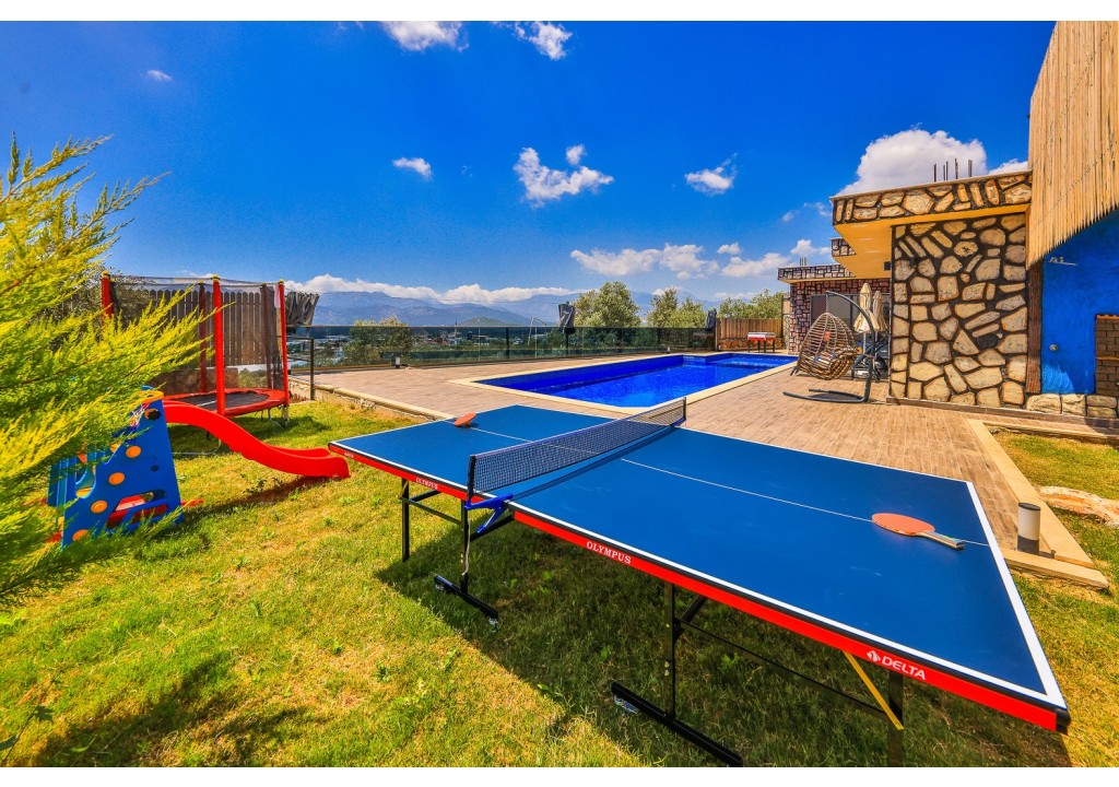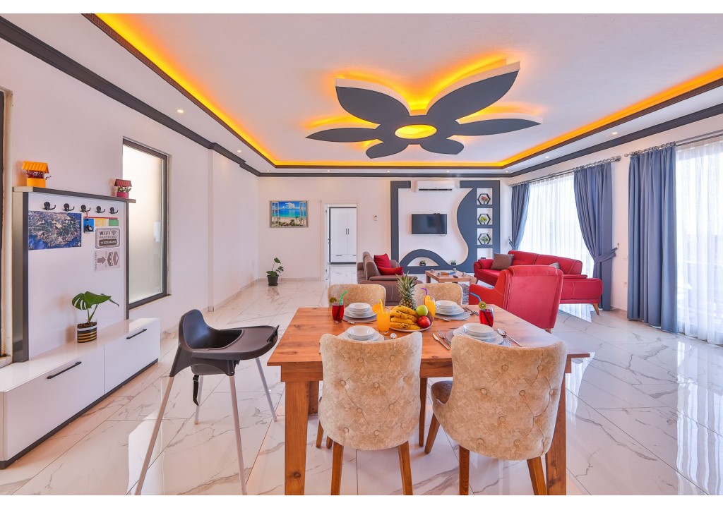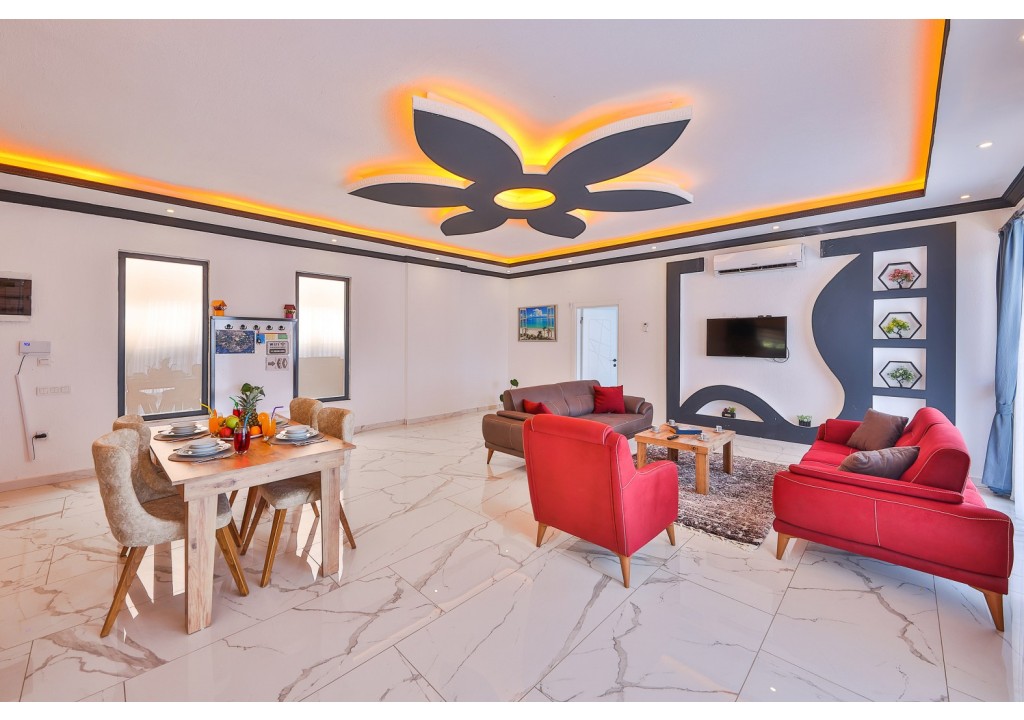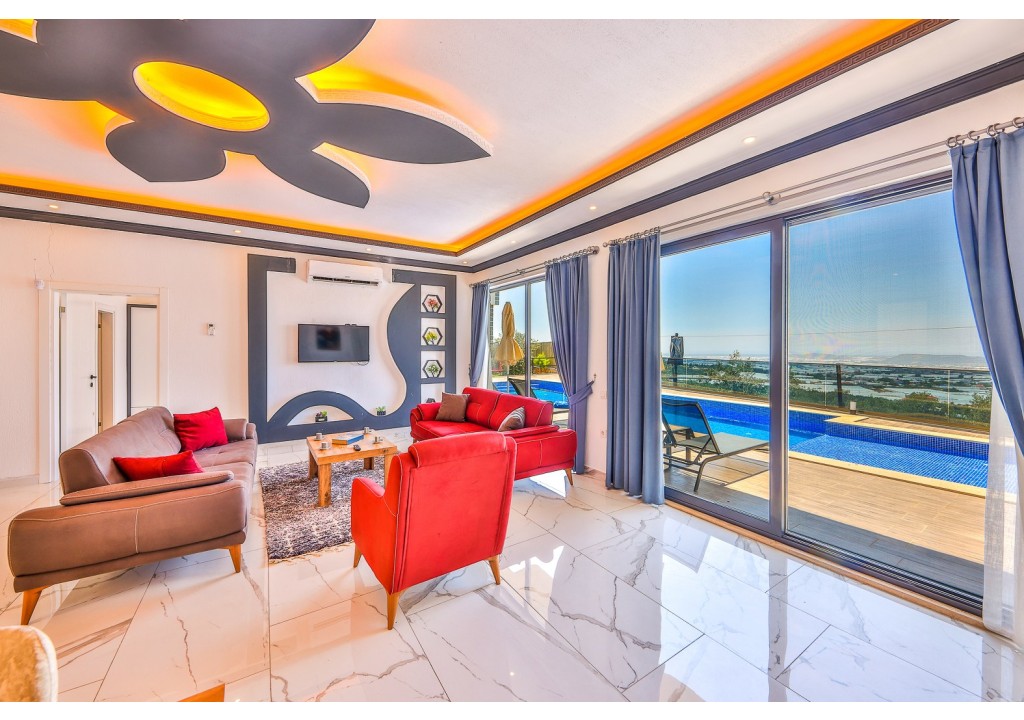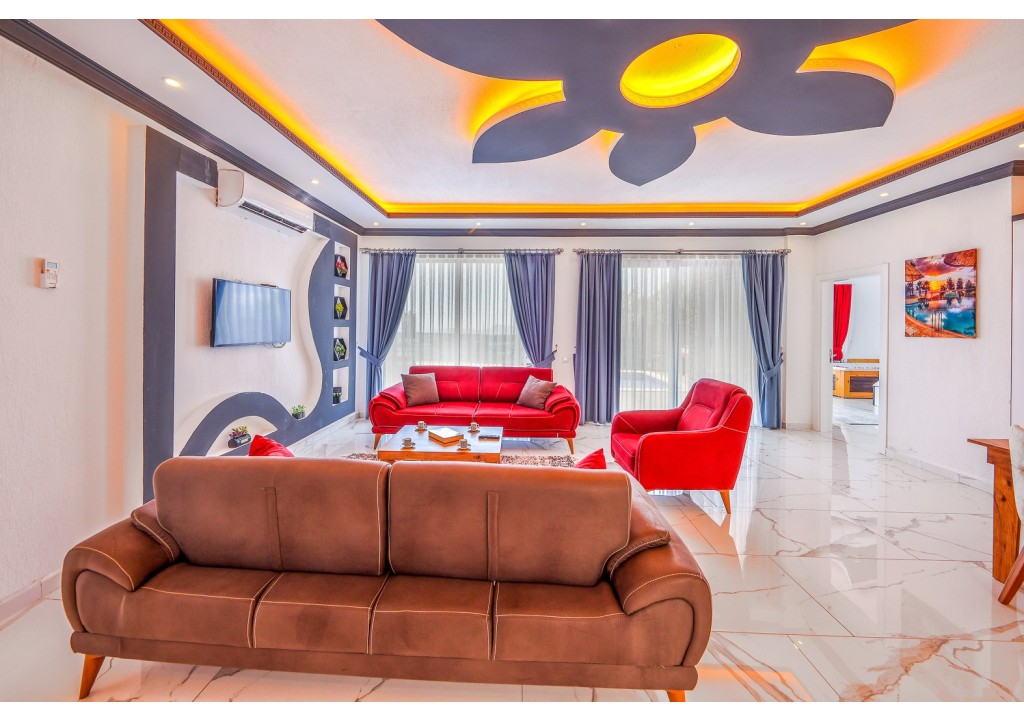 Detayları; Oturma grubu, Uydu TV (LCD), Klima, 4 kişilik yemek masası, Havuz terasına çıkış,