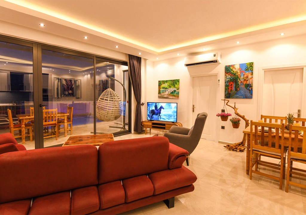 Detayları; Oturma grubu, Uydu TV (LCD), Klima, 4 kişilik yemek masası, Havuz terasına çıkış,