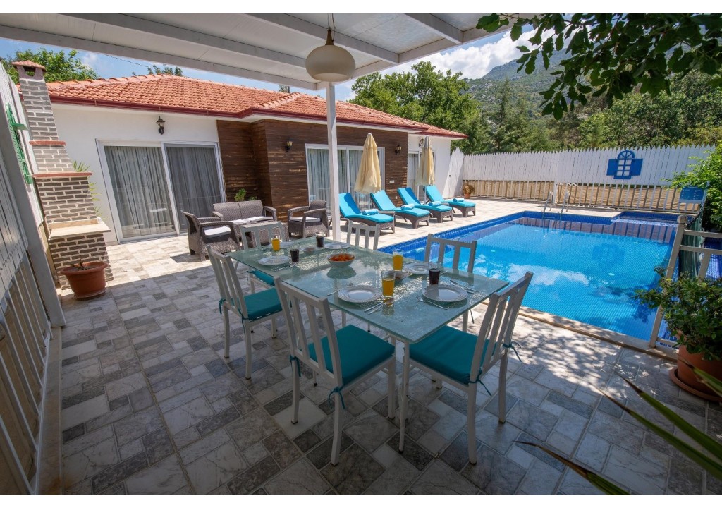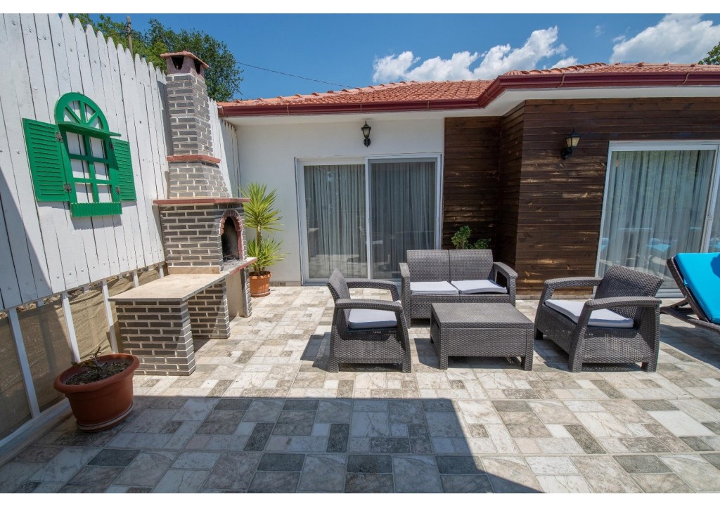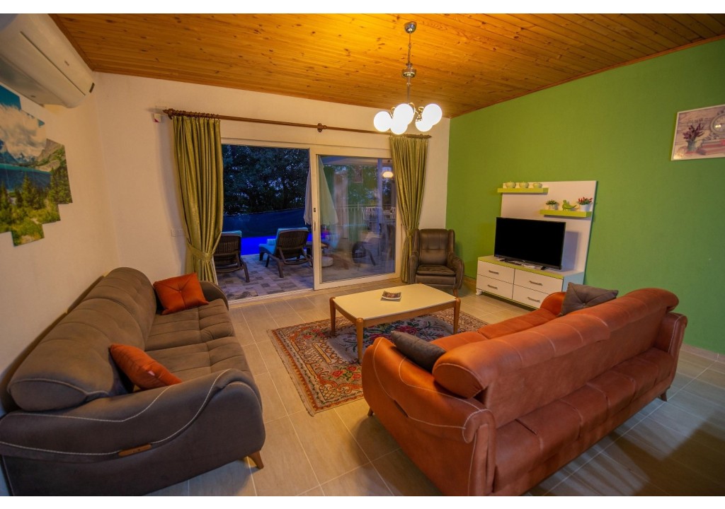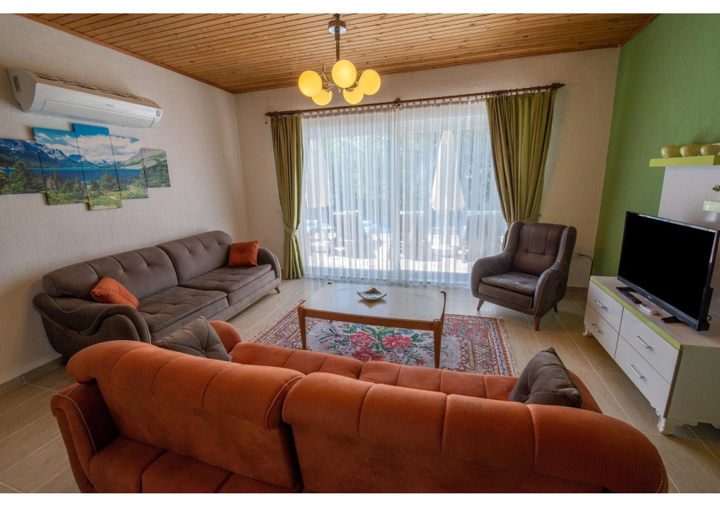 Detayları; Oturma grubu, Uydu TV (LCD), Klima, 4 kişilik yemek masası, Havuz terasına çıkış,