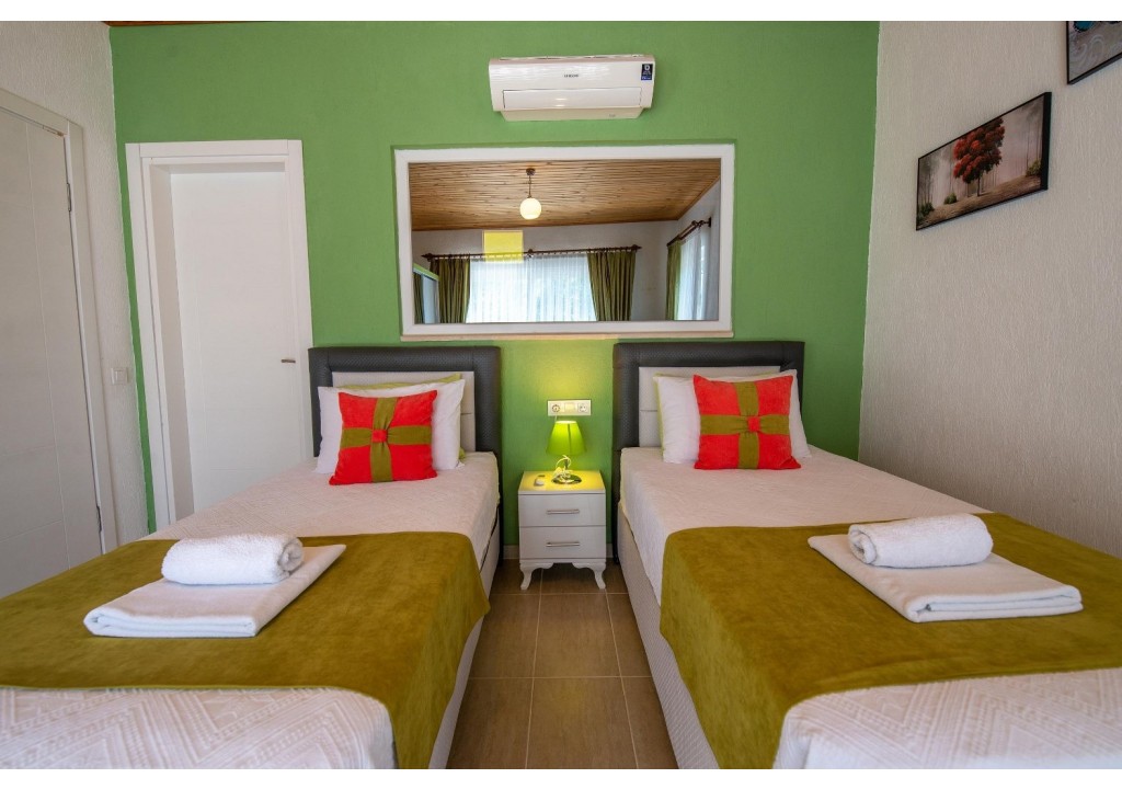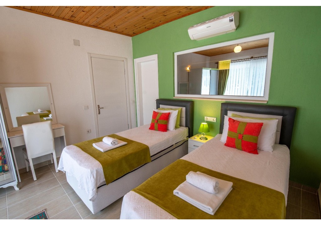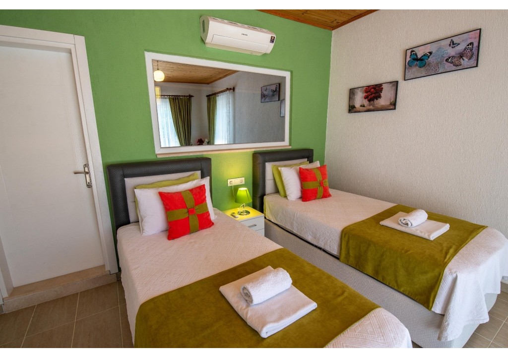 Detayları; İki adet tek kişilik yatak, komodin, klima, elbise dolabı, banyo ve tuvalet bulunmaktadır.