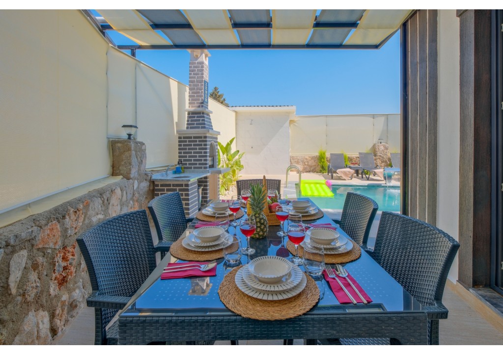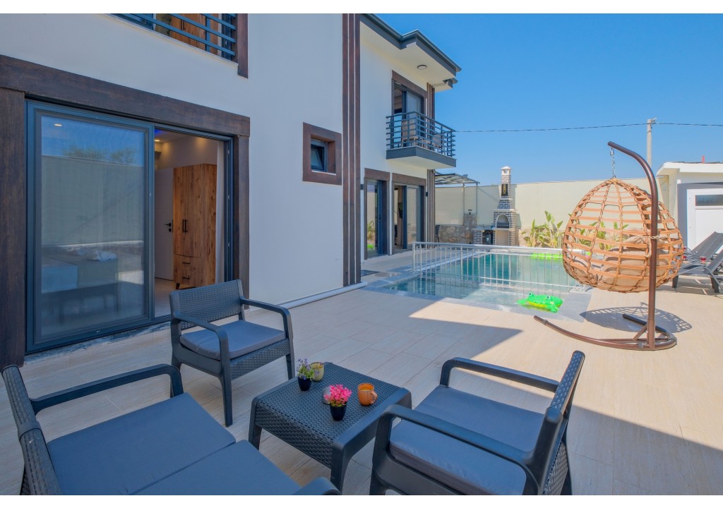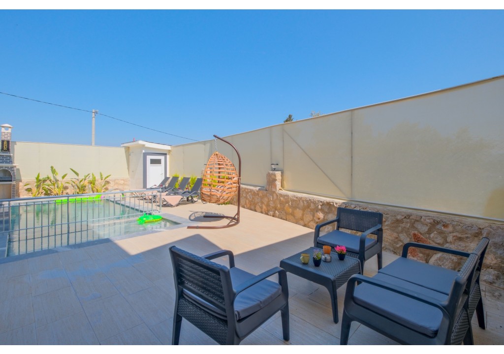 Detayları; Şezlonglar, güneş şemsiyeleri, yemek masası ve oturma grubu bulunmaktadır.