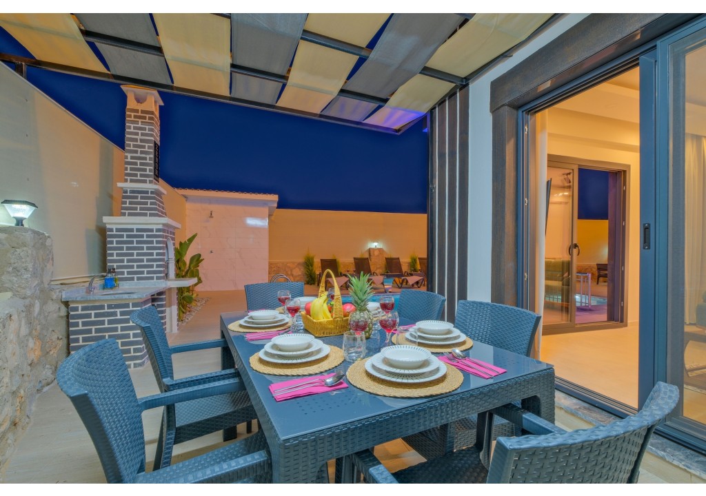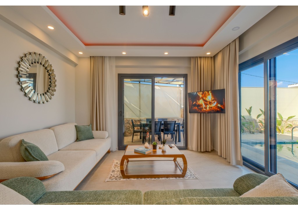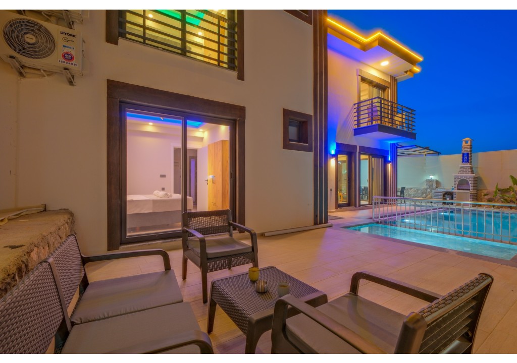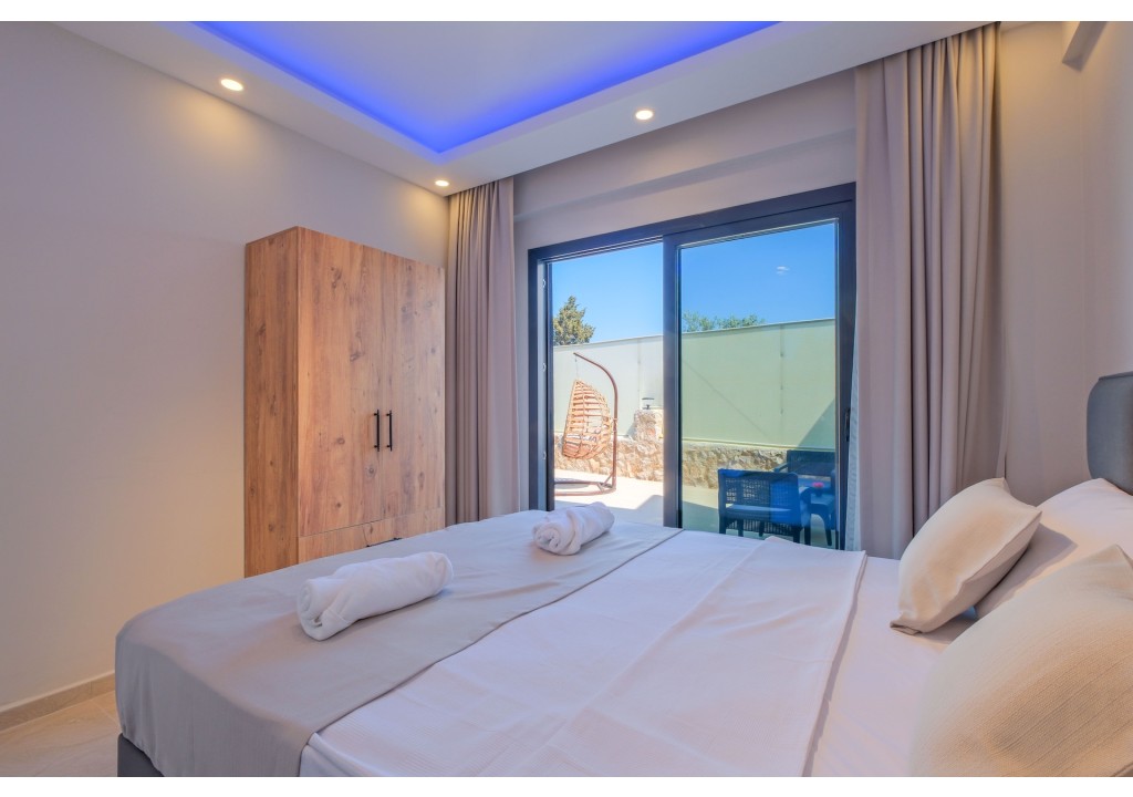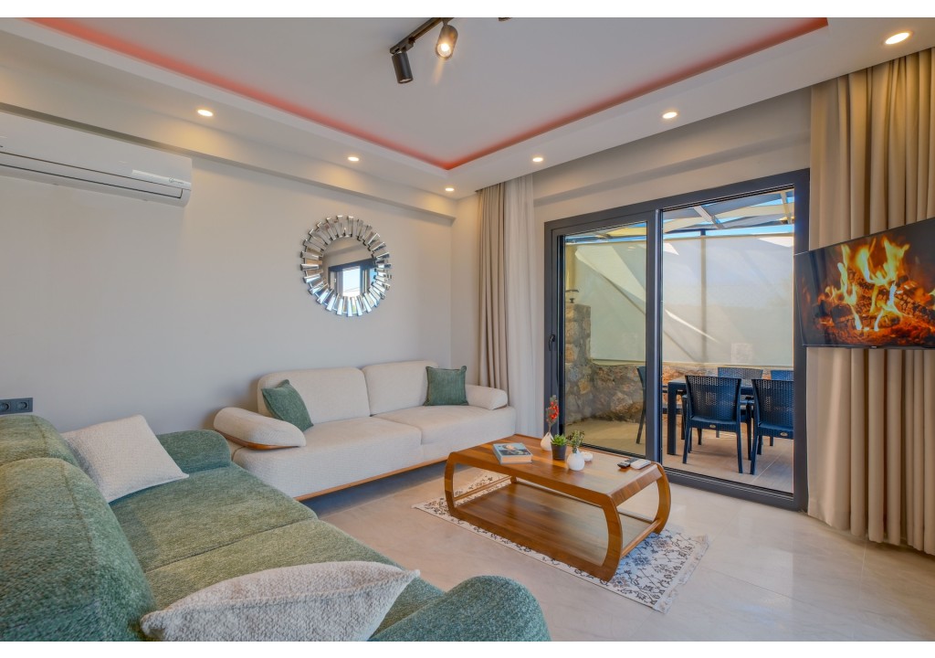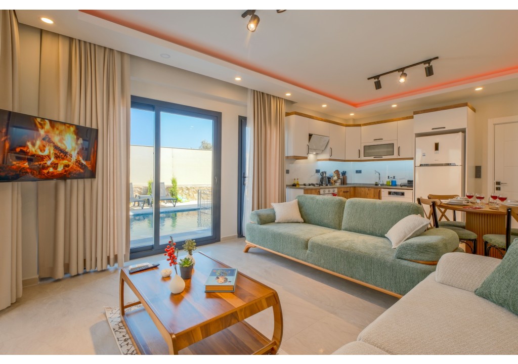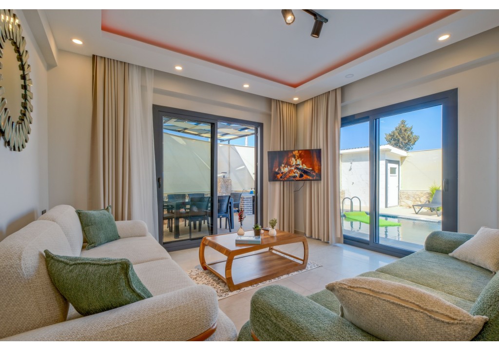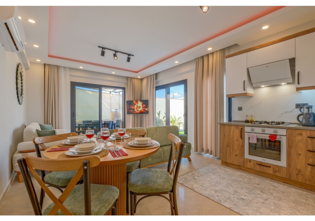 Detayları; Oturma grubu, uydu TV, klima, yemek masası ve havuz terasına çıkış bulunmaktadır.