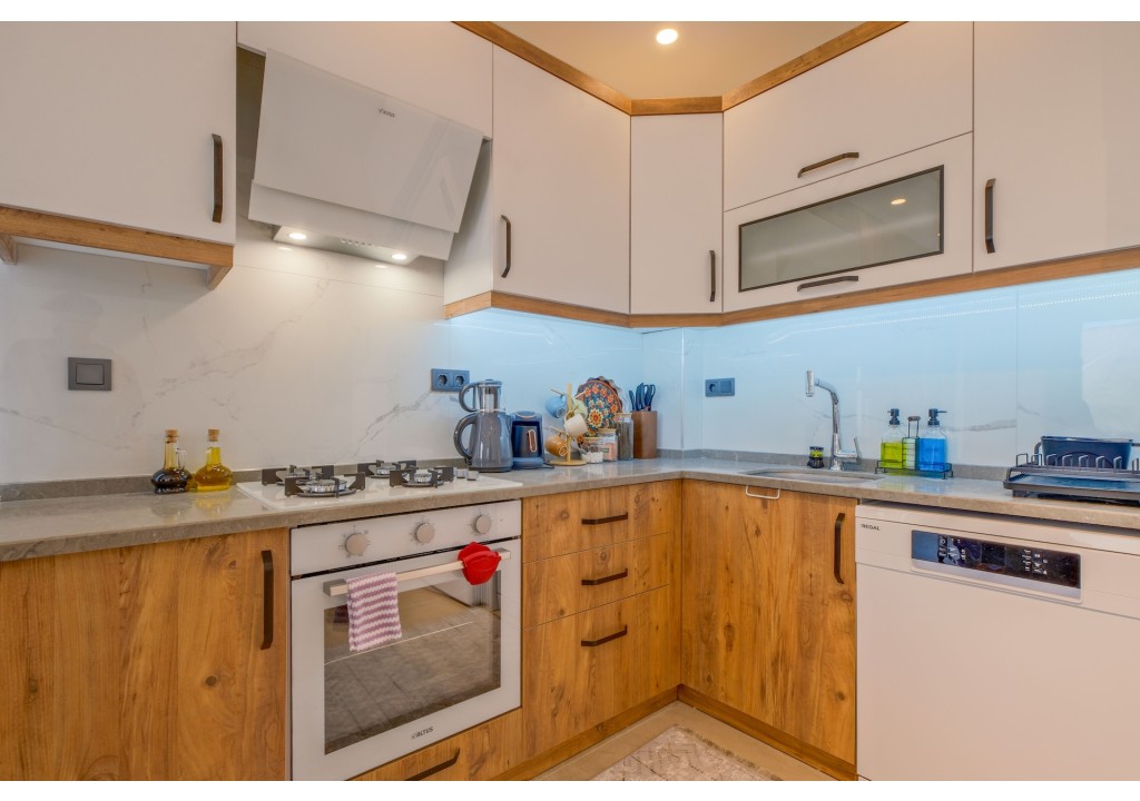 Detayları; Buzdolabı, bulaşık makinesi, fırın, 4’lü ocak, mikrodalga fırın, elektrikli su ısıtıcı, yemek takımı, tava, tencereler, çatal bıçak ve mutfak ekipmanları bulunmaktadır.