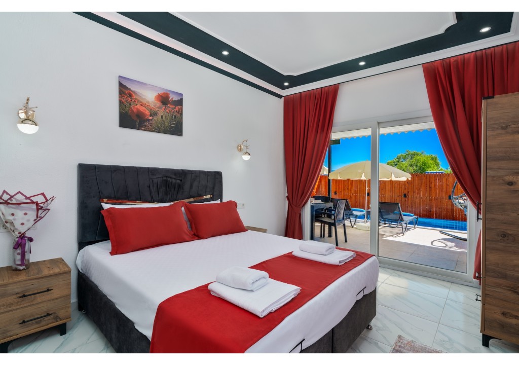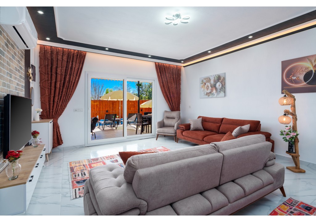Detayları; Oturma grubu, uydu TV, klima, yemek masası ve havuz terasına çıkış bulunmaktadır.