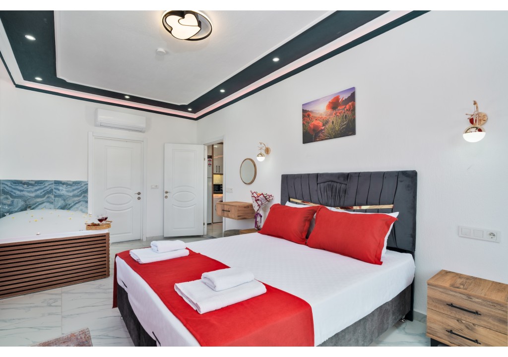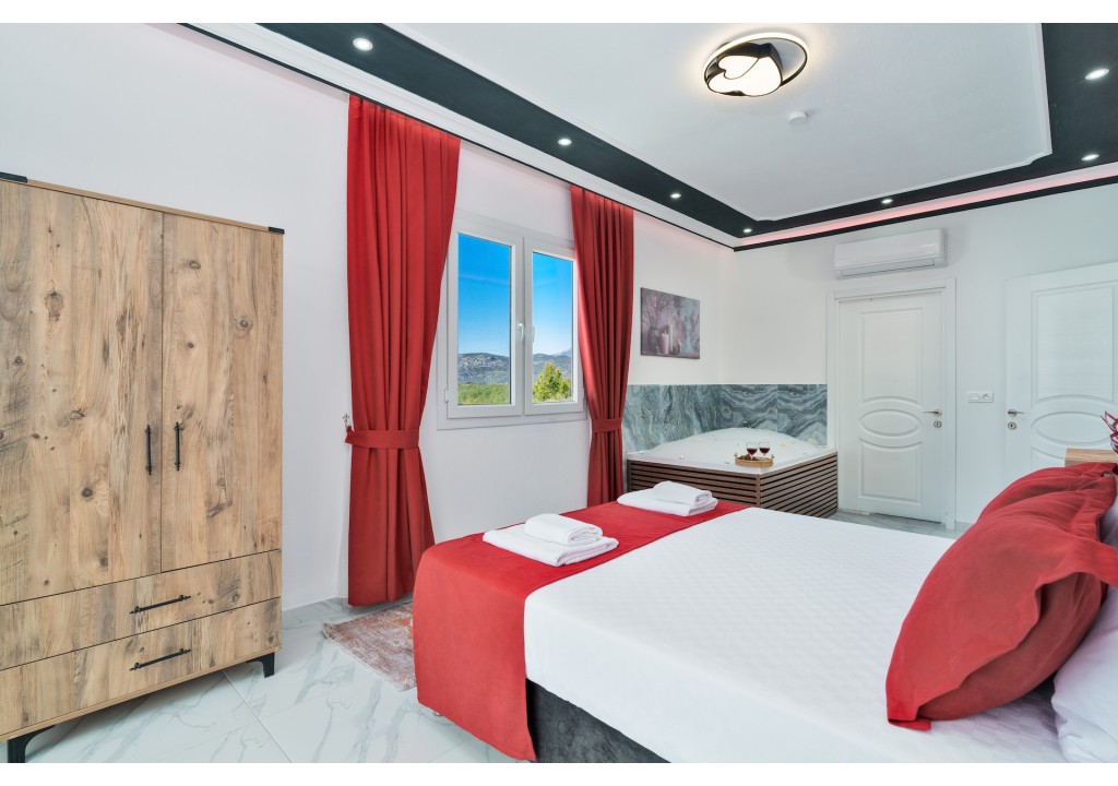 Detayları; Çift kişilik yatak, makyaj masası, komidin, klima, elbise dolabı, jakuzi, banyo ve tuvalet bulunmaktadır.
