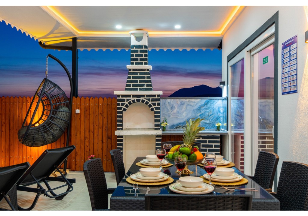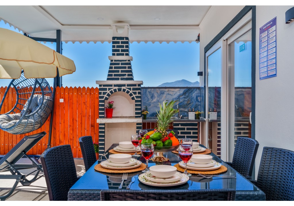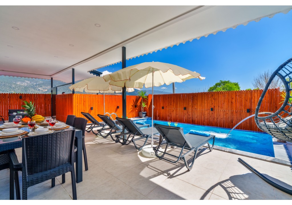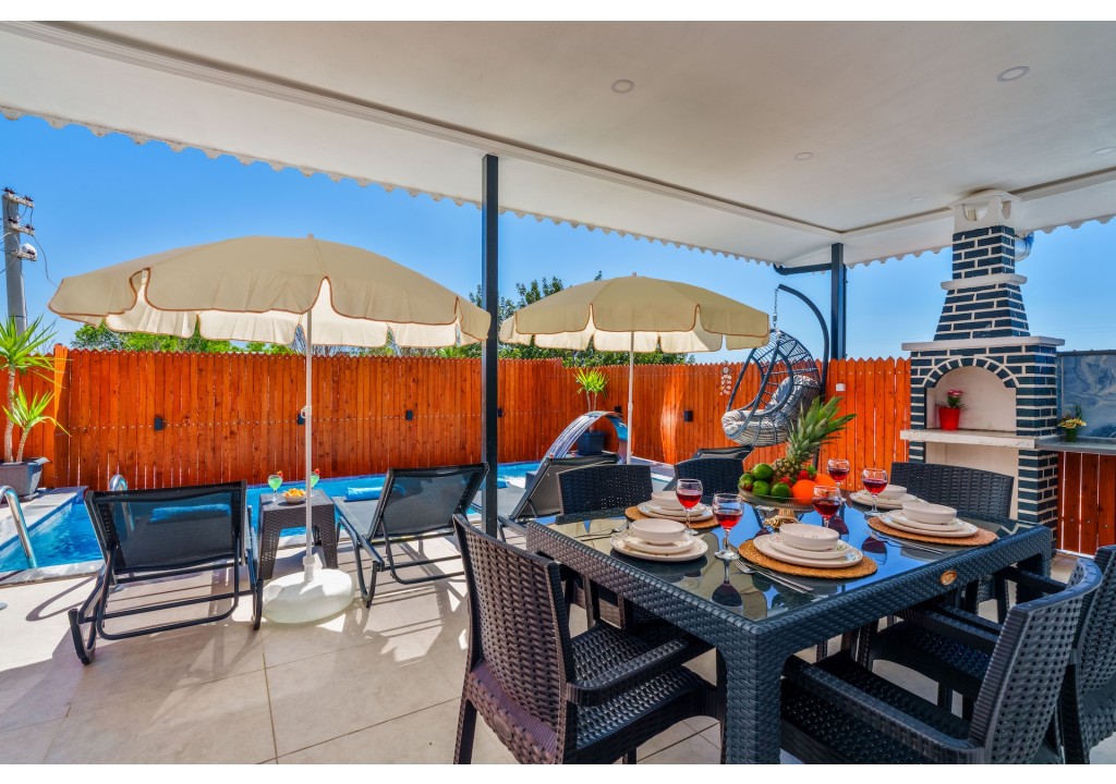 Detayları; Şezlonglar, güneş şemsiyeleri, yemek masası ve oturma grubu bulunmaktadır.