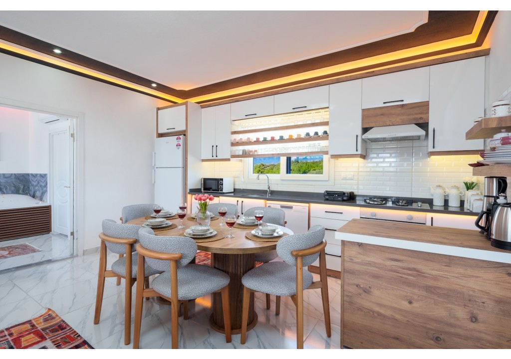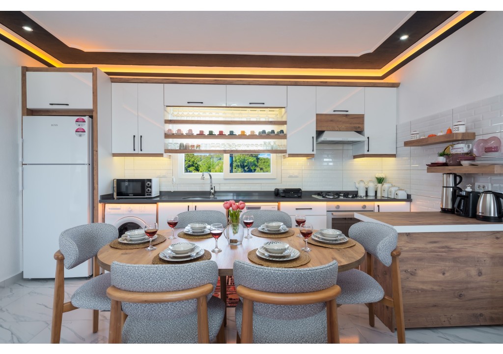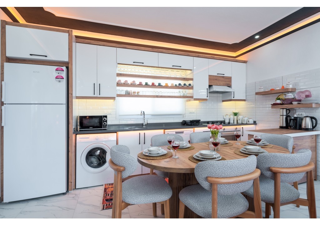 Detayları; Buzdolabı, bulaşık makinesi, fırın, 4’lü ocak, mikrodalga fırın, elektrikli su ısıtıcı, yemek takımı, tava, tencereler, çatal bıçak ve mutfak ekipmanları bulunmaktadır.